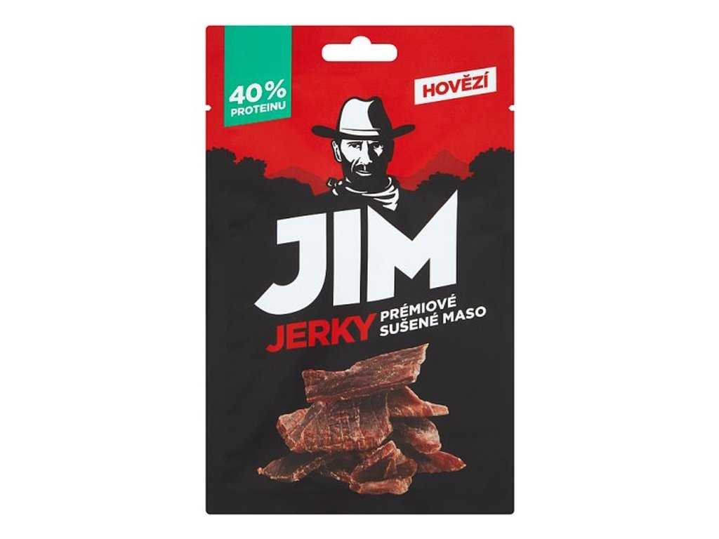 JIM Jerky hovězí - pochoutka z hovězího sušeného masa. Sušené maso hovězí -jemně zauzené. Trvanlivý masný výrobek, tepelně opracovaný.