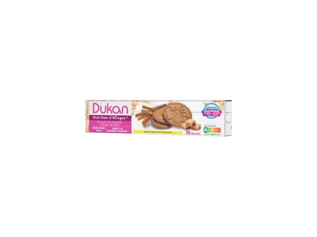 Křupavé a chutné sušenky vyvinuté speciálně podle receptury zakladatele diety Pierra Dukana. Jsou výborným spojením výjimečných vlastností ovesných otrub a karamelovo-skořicové příchutě. Obsahují 57 % ovesných otrub bio (mleté a proseté certifikované ovesné otruby Dukan M2bisB6 ®). Tyto sušenky jsou bez bílé mouky, bez přidaného cukru, s vysokým obsahem vlákniny a nízkým obsahem tuku. V tomto receptu byl cukr nahrazen maltitolem, který nezpůsobuje zvýšení hladiny cukru v krvi po požití.