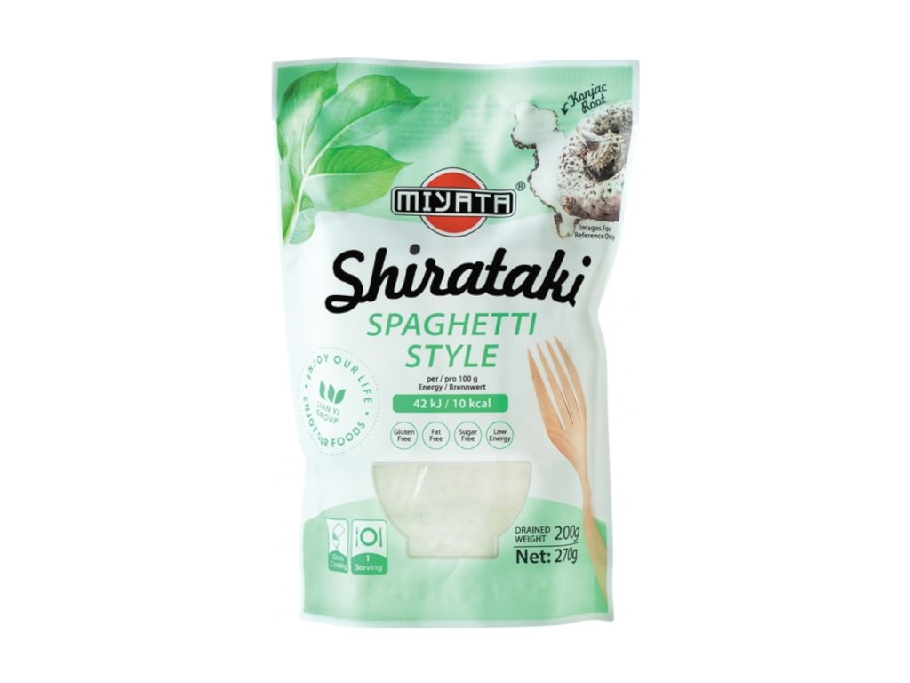 MIYATA Shirataki Spaghetti style (špagety) jsou jednou z variant Shirataki těstovin, které slouží jako zdravá náhrada klasických těstovin. Jsou vyrobeny z kořene rostliny zvané Amorphophallus konjac pěstované v různých částech Asie. Konjac obsahuje glukomannan, což je látka, která pomáhá se spalováním tuků a kontrolou váhy. Mimo jiné reguluje krevní cukr a snižuje choresterol v krvi. Proto je konjac ideální potravinou pro regulaci hmotnosti a pro prevenci obezity.
