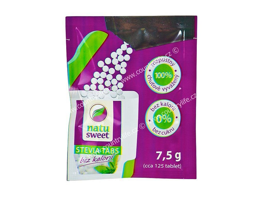7,5 gramový sáček obsahuje cca 125 tablet. Jedna tableta = jedna kávová lžička cukru.