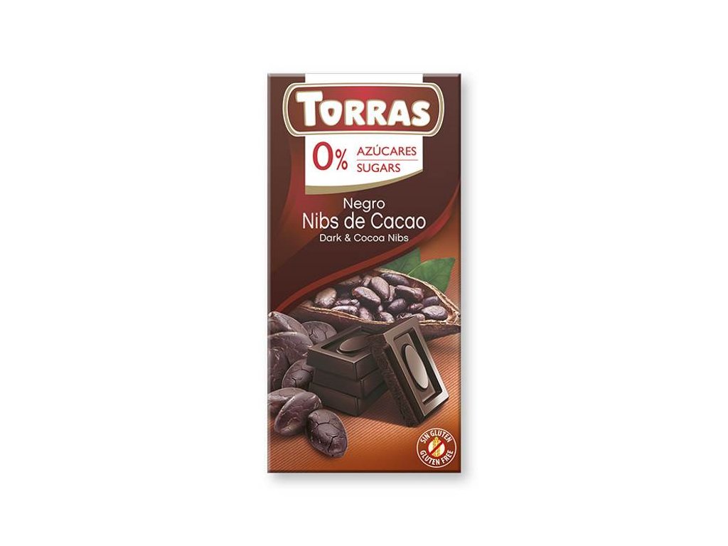 Hořká čokoláda s kousky kakaových bobů bez lepku, bez ztužených tuků a bez přidaného cukru se sladidly. Obsahuje pouze přirozeně se vyskytující cukry.